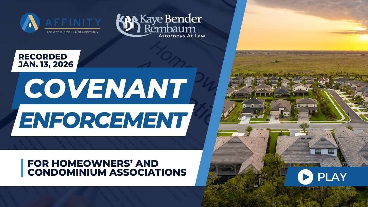 An informative webinar where we explored the importance of timely and uniform covenant enforcement, and the challenges that may arise due to inconsistent or delayed action. This session is ideal for CAMs, board members, and property professionals seeking to strengthen their understanding of the topic. Led by Emily E. Gannon, Esq. of Kaye Bender Rembaum; hosted by Affinity Management Services.