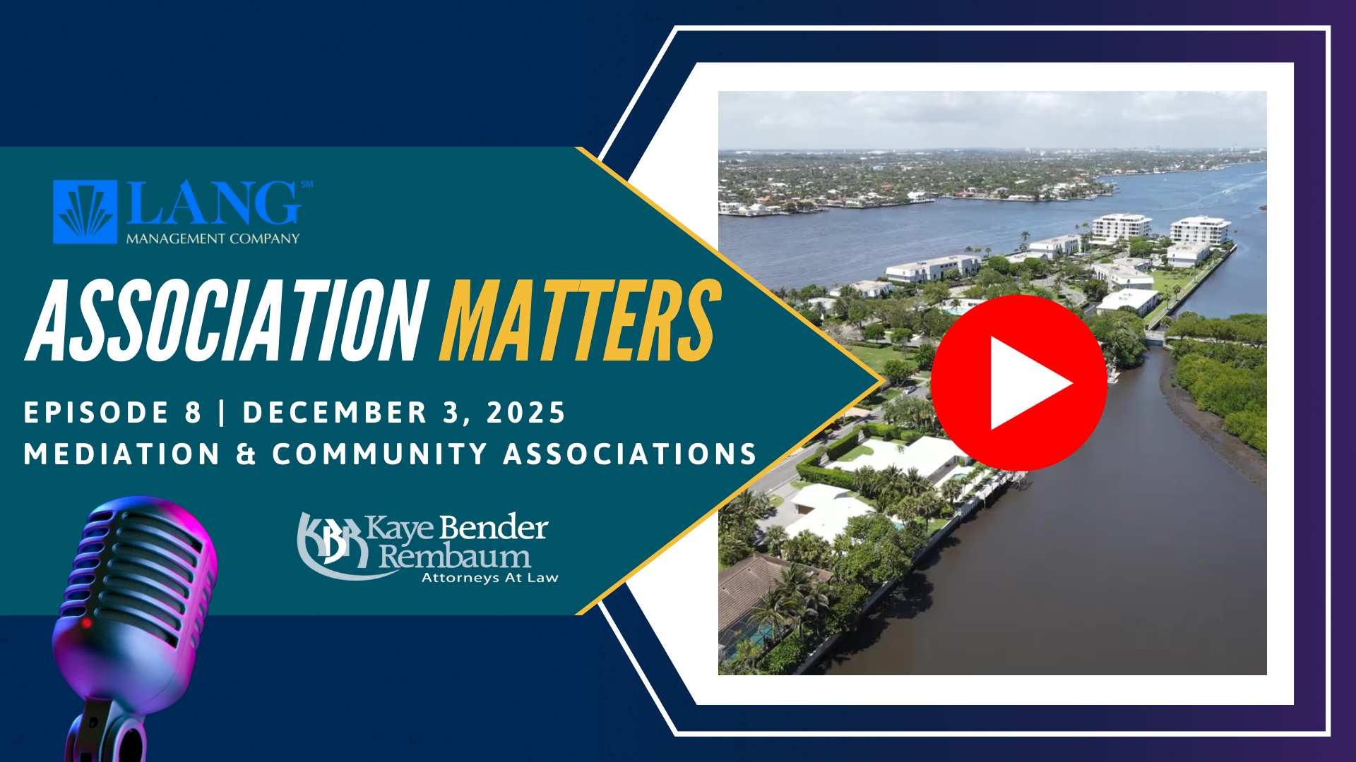 Co-hosted with Lang Management. On this edition we will cover neighbor to neighbor disputes and into the subject of presuit mediation, when it’s required and when it’s not, suspension of rights and more. This discussion will be moderated by Lang’s Marita Butzbach, along with panelists, Kaye Bender Rembaum attorneys Jeffrey A. Rembaum and Alan Schwartzseid; each of whom are Board Certified Specialists in Condominium & Planned Development Law.
